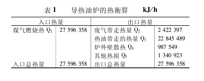 實(shí)測得出,焦爐煤氣的用量1706.7空氣用量7850.9m3/h,廢氣溫度207.0℃;,導熱油爐進(jìn)口油溫295.9℃,比熱2.00kJ/(kg•K),出口油溫318℃,比熱2.05 kJ/(kg•K),導熱油循環(huán)量310.6 t/h。